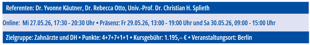 In diesem Kurs werden die Möglichkeiten und Grenzen der Verhaltensführung und Indikationen von Lachgas erläutert. Die Möglichkeiten der Sedierung mit Lachgas wird systematisch von Alternativen wie der Narkose abgegrenzt. Neben der Vorstellung der Voraussetzungen für die einzelnen Verfahren aus kinderzahnärztlicher und chirurgischer Sicht wird die Lachgassedierung in gegenseitigen Übungen intensiv trainiert. Zusätzlich werden die gängigen Verfahren – insbesondere der Kinderzahnheilkunde – die sich für die Lachgassedierung anbieten, im Licht der aktuellen Literatur und im Rahmen eines modernen Praxiskonzeptes präsentiert.