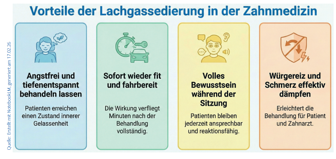 Seit Juni 2013 hat die Lachgassedierung durch die gemeinsame Stellungnahme der DGZMK und DGKiZ mit den Anästhesisten wieder ihren Platz in der Zahnmedizin. Insbesondere bei Patienten mit Spritzenphobien, Angst vor chirurgischen Eingriffen und Kindern bieten sich neben der Verhaltensformung/-führung auch Sedierungsverfahren wie z. B. mit Lachgas an.