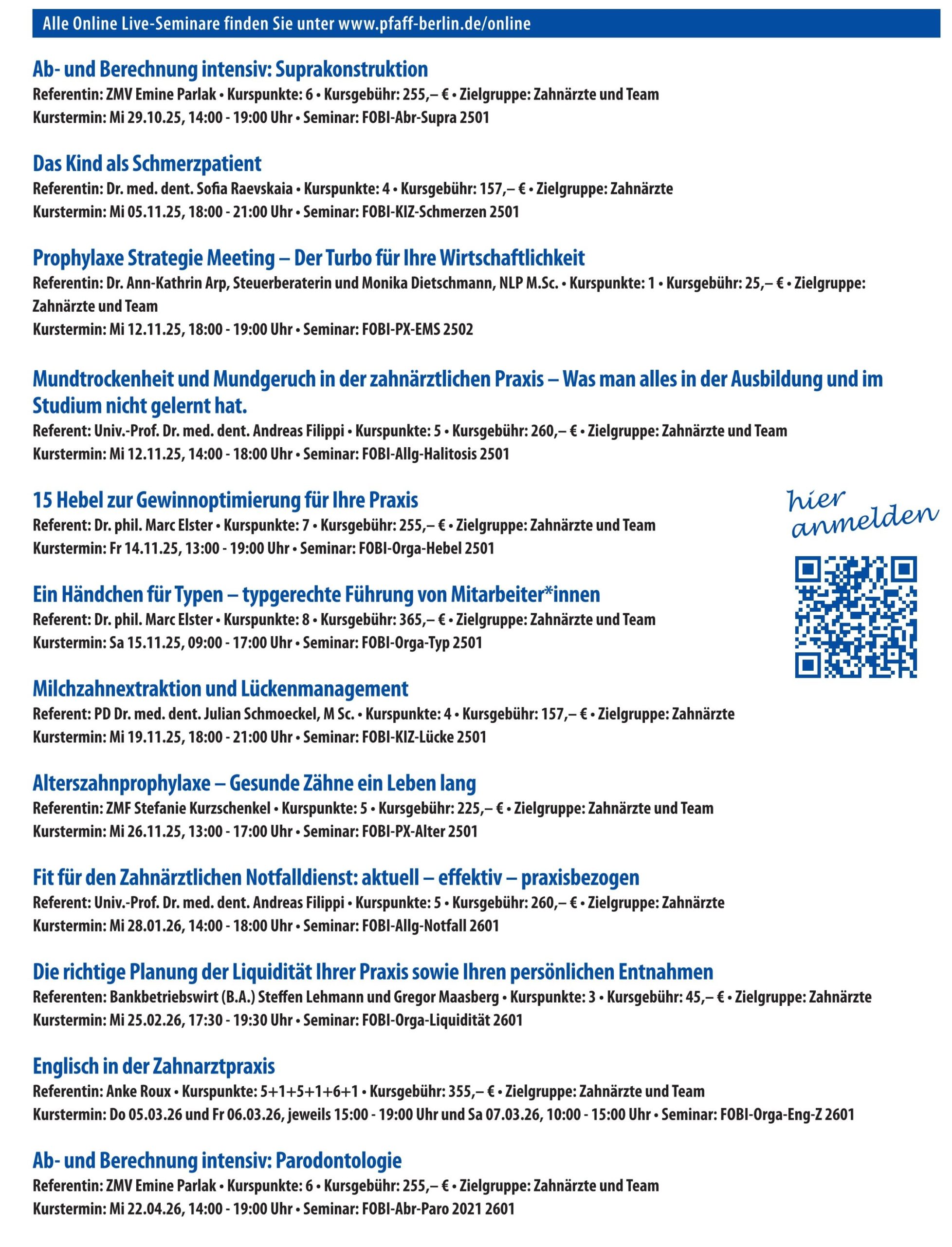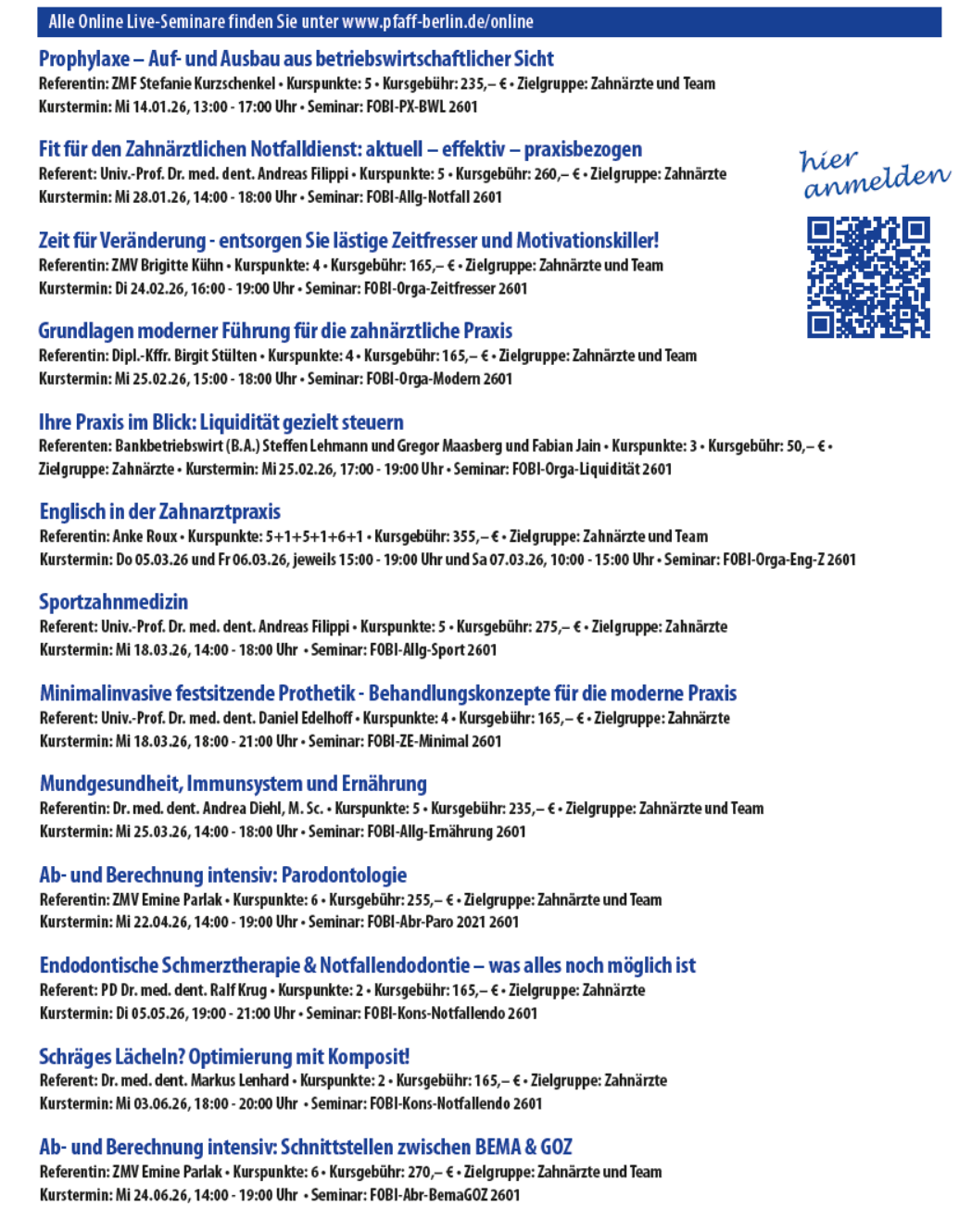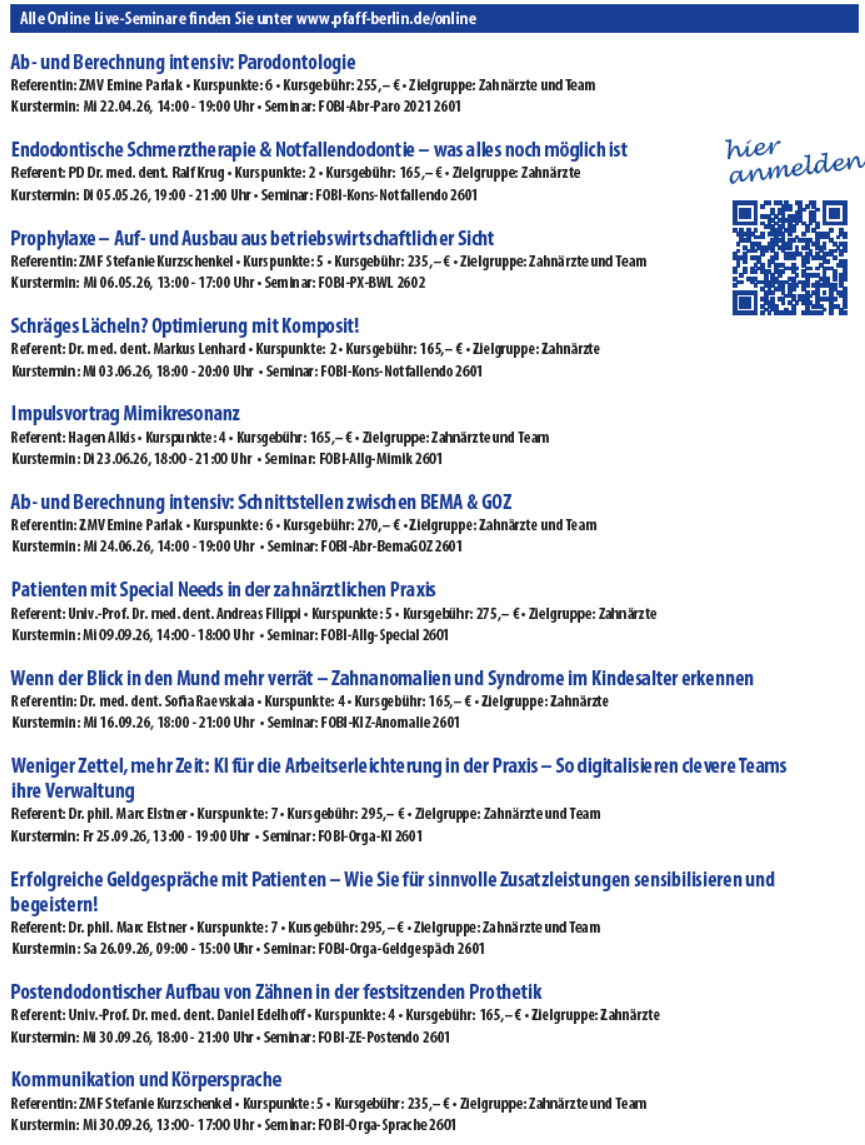 Um auch unter den vorherrschenden Bedingungen weiter den hohen Bedarf an Fortbildungen abdecken zu können, bietet das Pfaff-Institut aktuell Kurse an, welche online als Live-Veranstaltung durchgeführt werden.