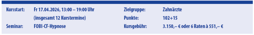 Bemerkung: für ein fakultatives, zusätzliches Zertifikat der Deutschen Gesellschaft für Zahnärztliche Hypnose (DGZH) müssen folgende Voraussetzungen erfüllt sein: