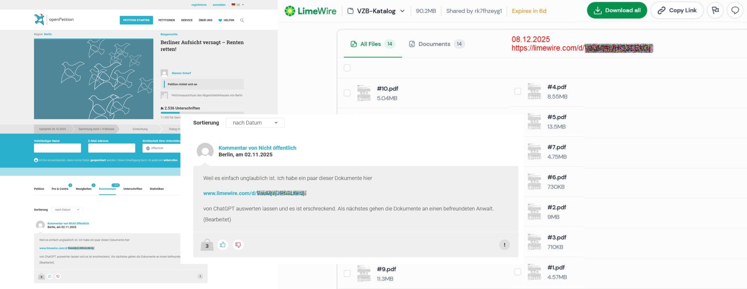| 2025-10-26 | openPetition | Mareen Scharf | Berliner Aufsicht versagt – Renten retten! __________ Anmerkung: Am 02.11.2025 wurden dort als "Kommentar von Nicht öffentlich" ein Link zu LimWire auf die 14 "M./K." Briefe veröffentlicht. |