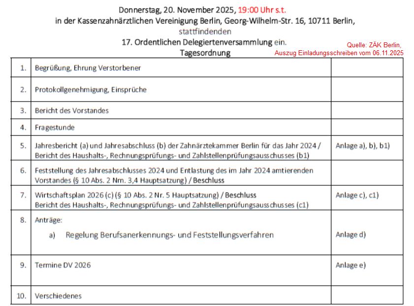 20.11.2025: Terminhinweis Delegiertenversammlung ZÄK Berlin 7. November 2025 Delegiertenversammlung, Zahnärztekammer Berlin