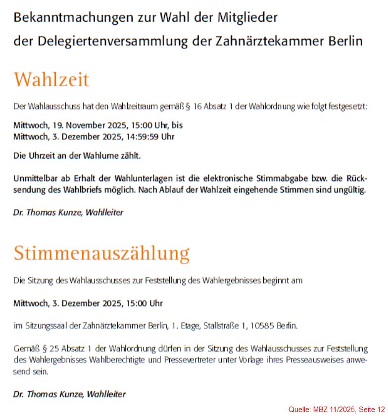 03.12.2025: Stimmenauszählung Beginn 15:00 Uhr 2. Dezember 2025 Kammerwahl 2025, Zahnärztekammer Berlin