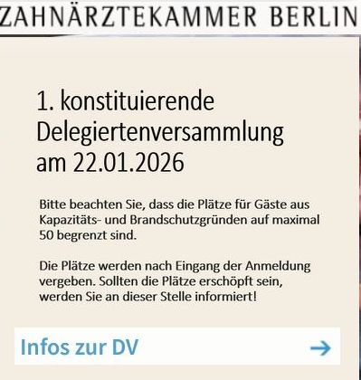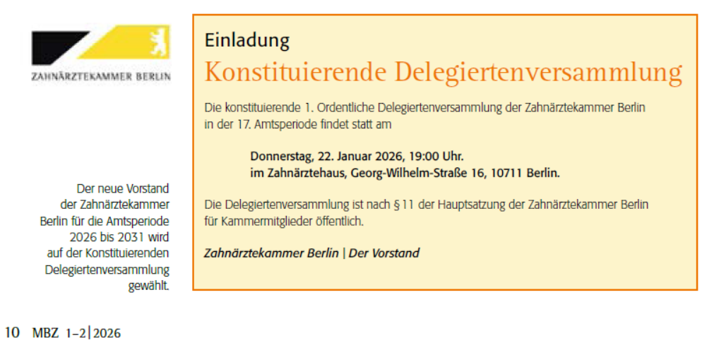 22.01.2026: Terminhinweis konstituierende Delegiertenversammlung ZÄK Berlin mit Tagesordnung und Besucherhinweis – Update: alle 50 Besucherpätze sind ausgebucht