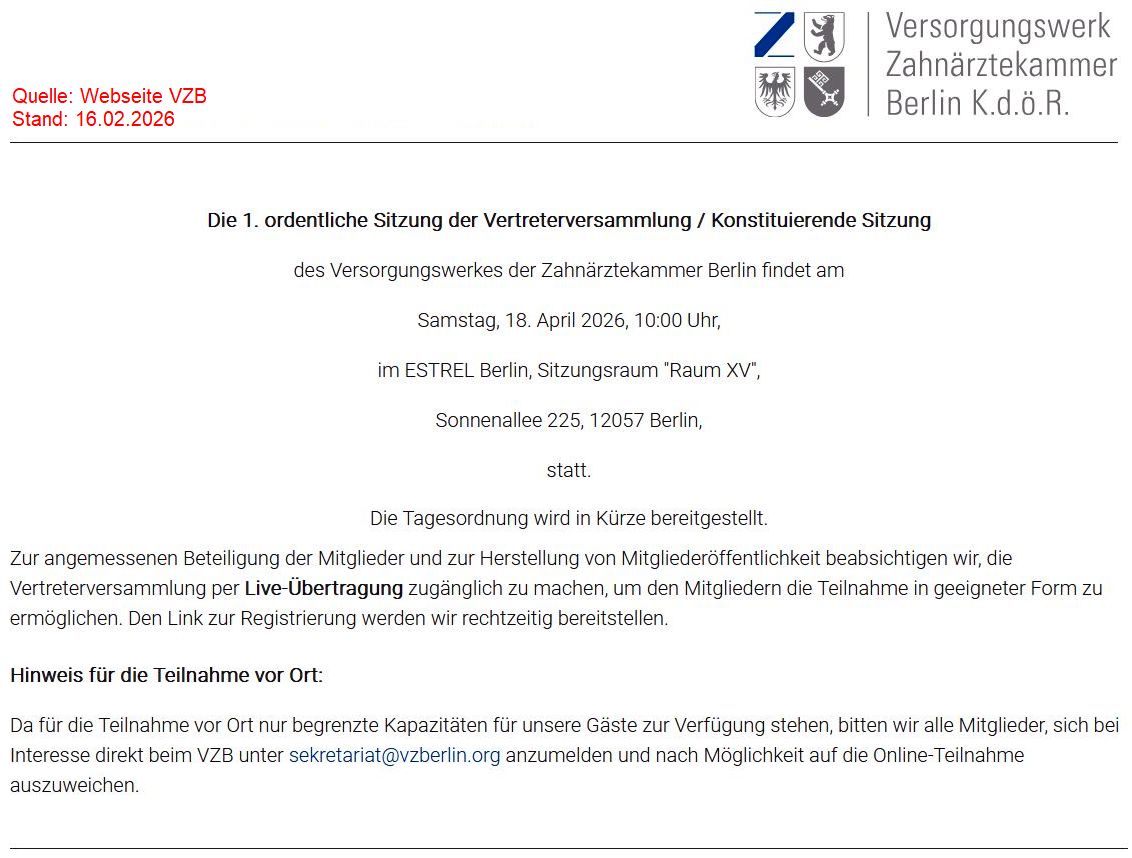 18.04.2026: Terminhinweis konstituierende Vertreterversammlung VZB 20. Februar 2026 Versorgungswerk VZB, Vertreterversammlung VZB